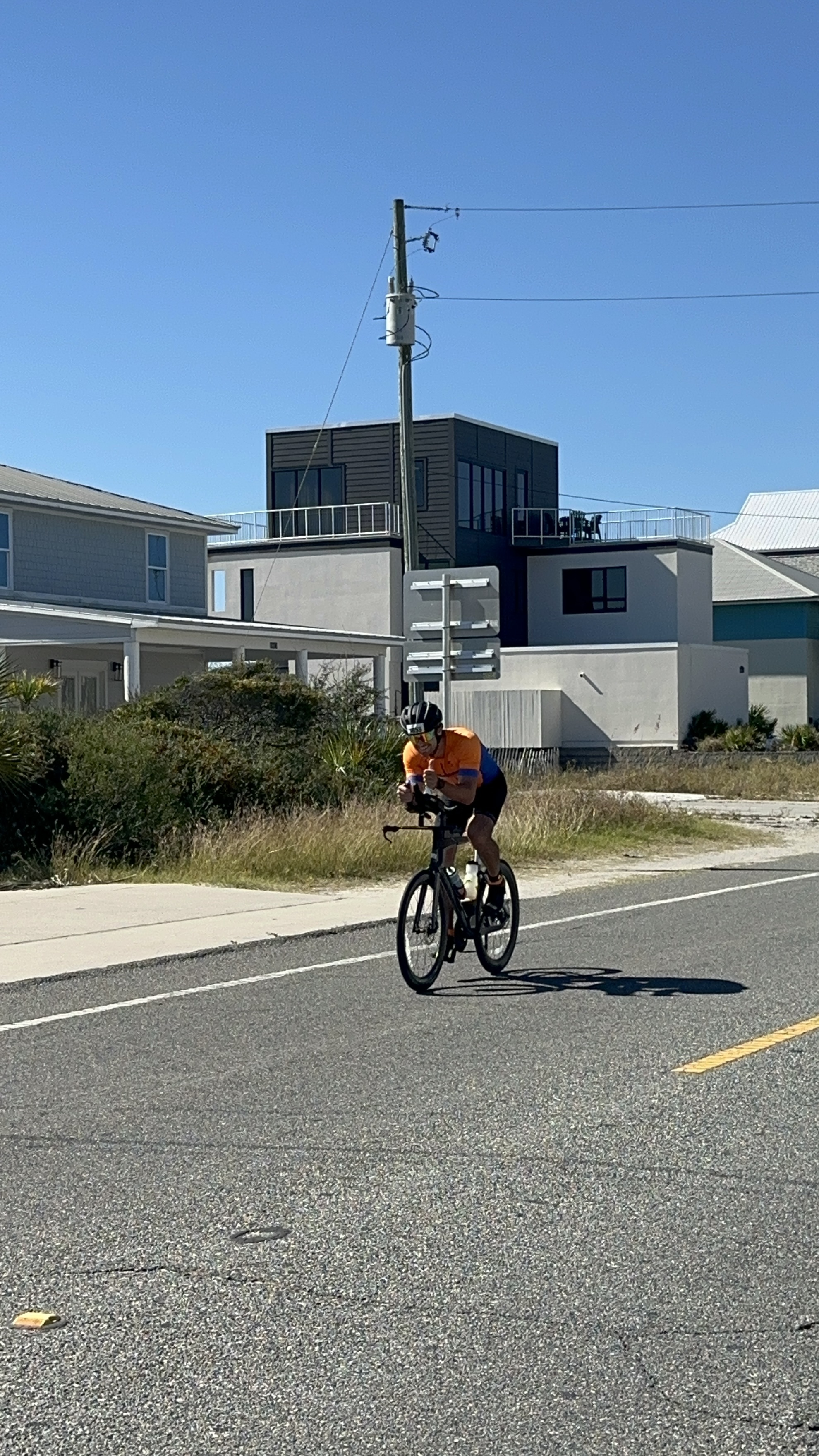 The water was super calm, despite my worries that the gulf coast winds would make for very rough waters. Athletes were sent out in groups of 3, roughly 5 seconds apart. My goal for the swim was around 1hour 15min based on my pace during practice swims, but I didn’t account for how much the wetsuit would help my pace.